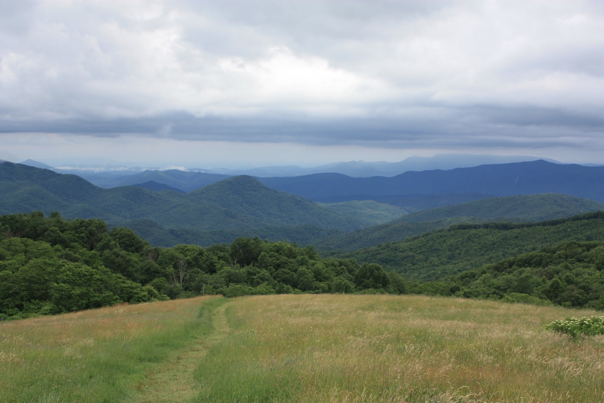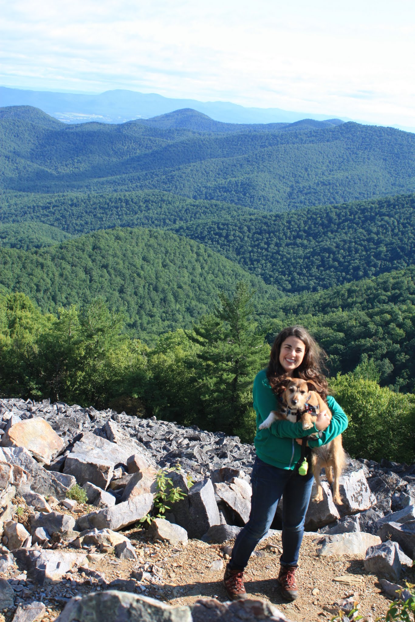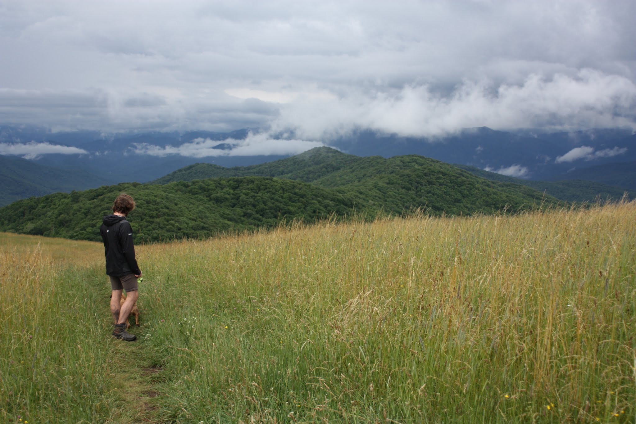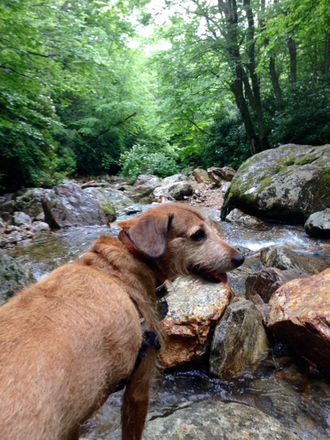 On July 4th, we hiked out to Skinny Dip Falls to go swimming, but unfortunately it was grey and rainy so we decided not to jump in.  We’re pretty sure Vera was ok with that idea since she associates water only with taking a bath (one of her least favorite things to do).  FullSizeRender(1)Probably my favorite hike was the morning we climbed to the top of Max Patch, an area on top of a mountain once cleared for a pasture, that offers 360 degree views of the Great Smokey and Black Mountain Ranges. Views for days…