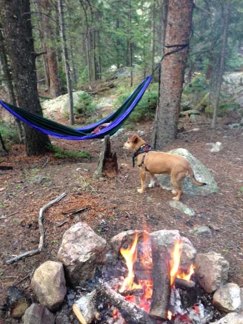 We were completely unprepared for our first night in the beautiful state.  We figured we could easily find a campsite- since there are hundreds- it turns out, however, we completely underestimated Coloradans’ love of the mountains.  Every single campsite was full and we were beginning to worry that we’d have to just pull off to the side of the road and sleep in our car until a cop told us to move- this is made worse by the fact that our car is Completely Full and our seats will in no way recline.  Adam took the reigns and went into the ranger station near Longs Peak and asked the advice of some of the nicest park rangers that ever lived.  They told us about free dispersed camping just down the road- which also happened to be some of the best campsites Adam and I had ever been to (at least without having to sling backpacks on our backs and hike miles to seclusion- this site we drove right up to). We also got to use our hammock for the first time! IMG_3161I’m not sure Vera likes it as much as we do…  It was such a great night- the weather was perfect, we saw millions of stars (a cute little kiddo near us exclaimed that there were “30 stars!”), and we didn’t have to pay a dime for our stay.  It was actually hard to pack up camp the next morning and move on to our cabin in Raymond.